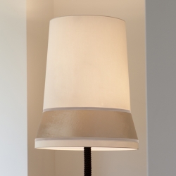 Lampadaire AUDREY TA modèle iconique inspirée du chapeau de d'Audrey Hepburn portée dans Breakfast at Tiffany. Pensée pour les environnements exclusifs et élégants, c’est un véritable exercice de style. , sa tige entourée de cordons de soie tressée noire, son abat-jour en coton ivoire avec une bande de velours d'ivoire soie ivoire , soit coton ivoire velours ivoire , passementerie soyeuse noire un diffuseur en plexiglas glacé Satin . Lampe Audrey joue avec les matières. Existe en deux couleurs de diffuseur.